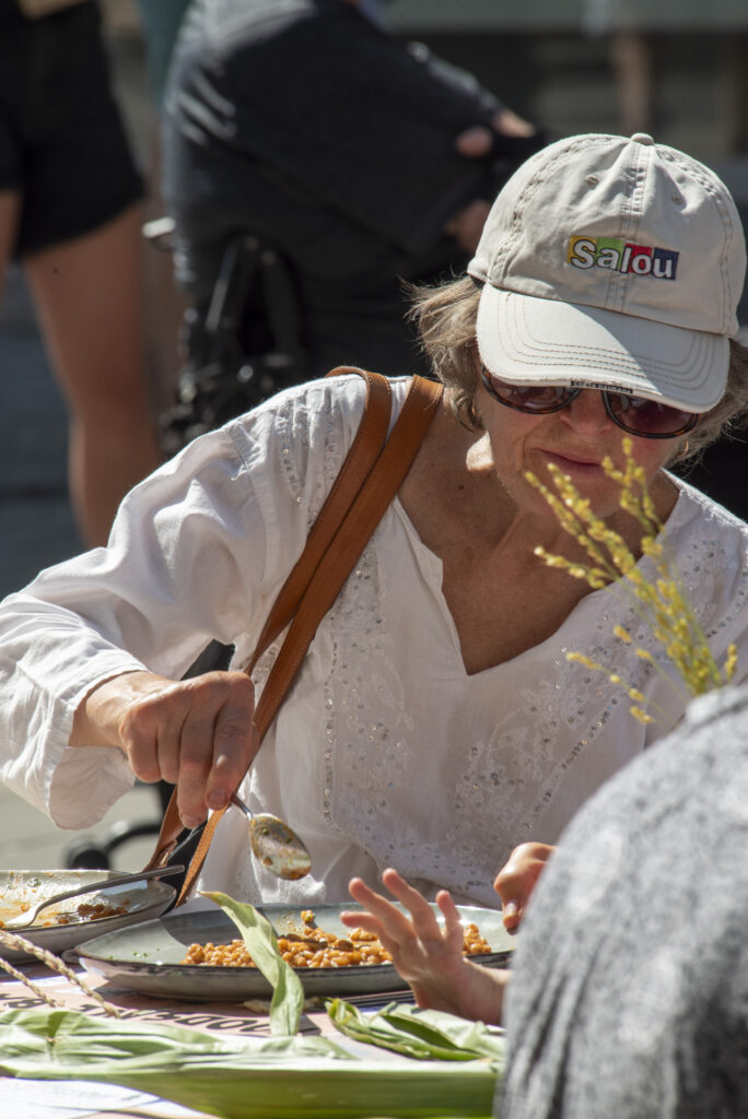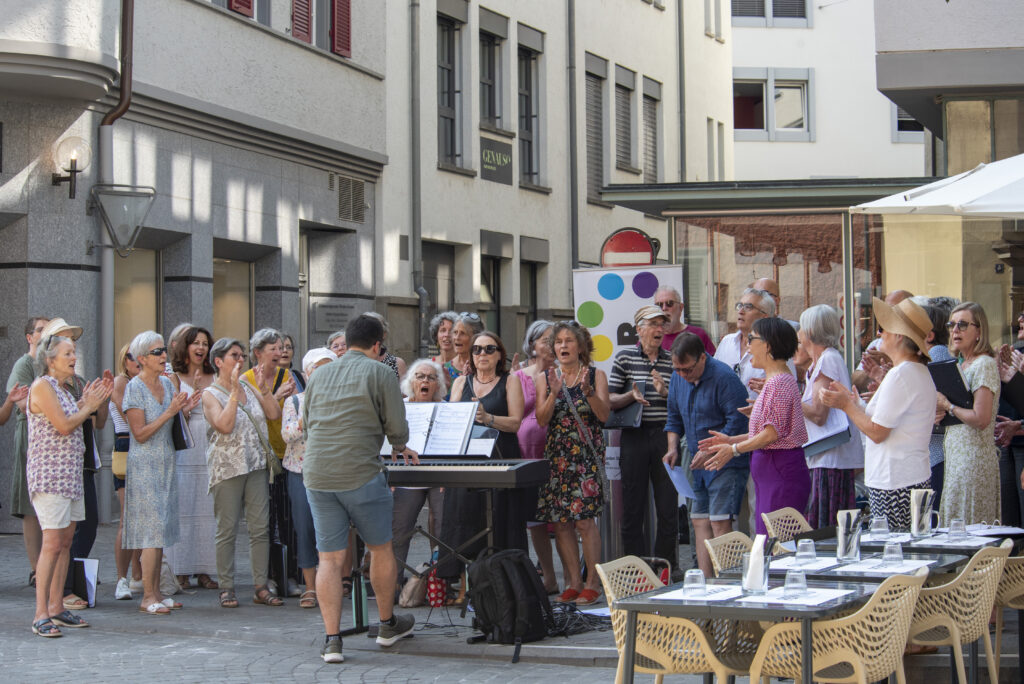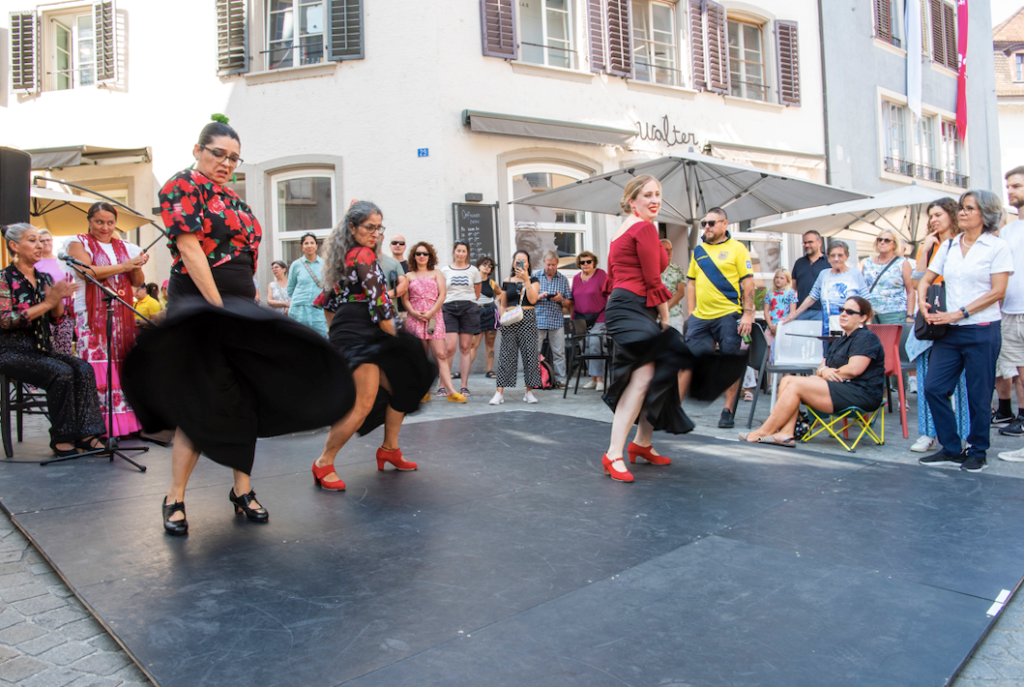 Punkt zwei Uhr eröffneten die BluesKidz das „Stadtpicknick-meets-Foodsave-Bankett“ am Eingang der Weiten Gasse. Am anderen Ende, beim Löwenbrunnen, wurde ein Drei-Gang-Menü kostenlos ausgegeben. Gezaubert wurde dies von den Köchen der Trafo-Hallen Baden aus teilweise nicht marktkonformem Gemüse. Die Zunft Cordula war für die Getränkebar zuständig und bot ihren lokalen Zunftwein an. Das vielfältige kulturelle Angebot umrahmte das Foodsave-Bankett. Mit seinen drei Auftritten berührte der Weltchor die Passantinnen und Passanten. Viele Kinder bastelten an den Tischen, die vom Historischen Museum und der Stadtbibliothek betreut wurden. Das Tanzkollektiv PR.SMA schlängelte sich an der langen Tafel vorbei und performte auch unter dem Stadtturm. Mitten in den Möbeln von Lüscher-Wohnen konnte man der Lesung von Gabrielle Susan Ruetschi folgen. Die Kids-Company „Hand und Fuss“ sorgte für coole Stimmung in der Weiten Gasse und eine verirrte Taucherin suchte nach Brunnen, Limmat und Wasser. Die beiden Stadtführerinnen erklärten so manchem überraschten Gast, was für verschiedene Angebote auf ihn warteten. Im lang ersehnten Schatten, der nach vier Uhr endlich auf die schön geschmückte lange Tafel fiel, sassen fröhliche Menschen und verspeisten alle dreihundert angebotenen Menüs rübisstübis. Als gegen Ende der Veranstaltung, die von 14 – 17 Uhr festgesetzt war, die Flamenco-Tänzerinnen der Flamenco-Schule von Silvia Chanivet zum zweiten Mal fulminant und bejubelt auftraten, fühlte man sich fast wie auf einem Volksfest in Südeuropa.