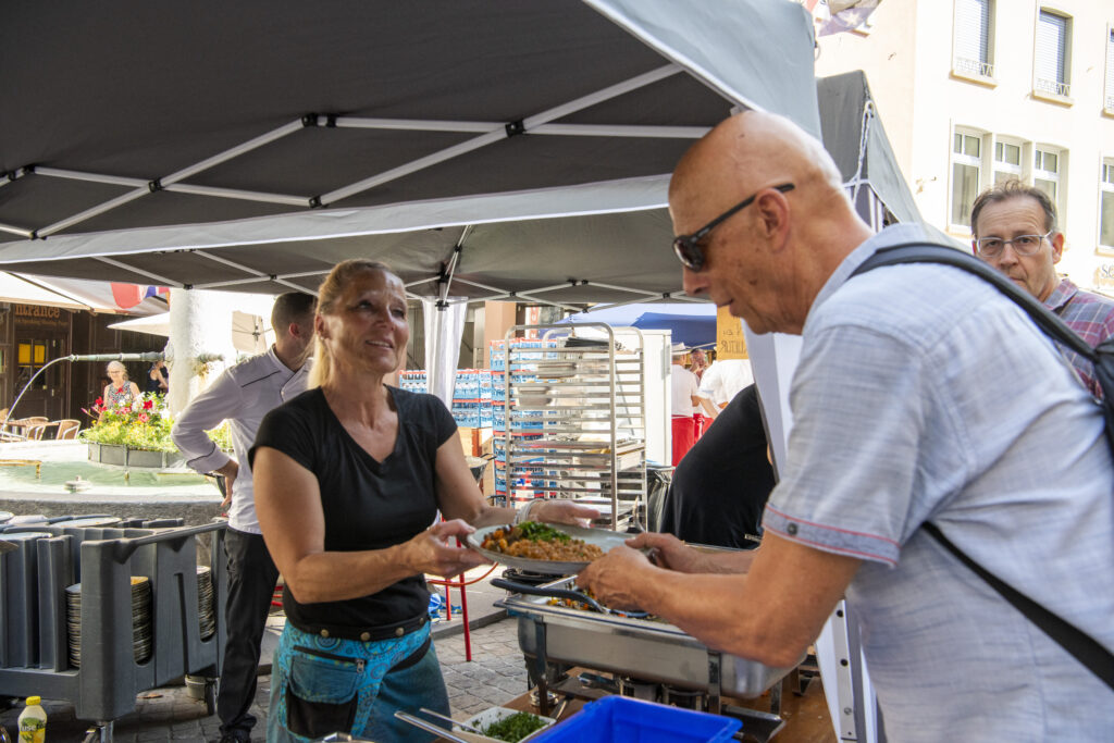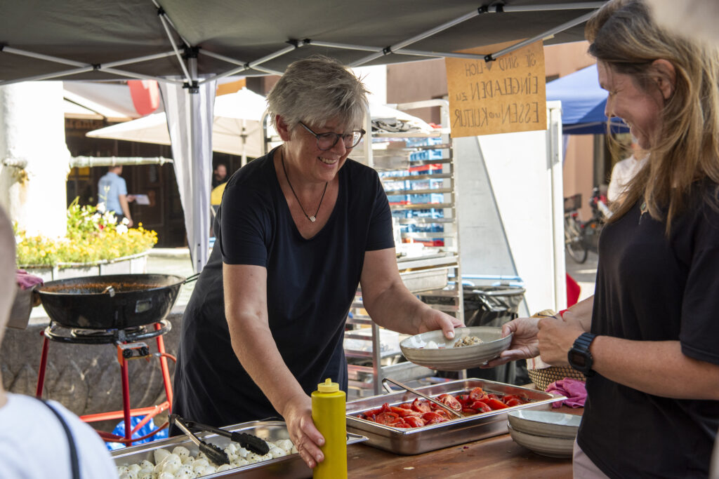 Geduldig wurde in der Schlange gewartet, um eines der 700 auf Kollektenbasis offerierten Menüs zu probieren – aufgrund der hohen Nachfrage waren es 200 Portionen mehr als ursprünglich geplant. Das freute auch die Mitglieder von Kulturaktiv und der Reformierten Kirche sehr: Die Initiator:innen Susanne Slavicek, Nadine Tobler und Pfarrer Res Peter sind sich einig: «Dass sich mit dem Stadtpicknick-meets-Foodsave-Bankett so viele Menschen auf dem neuen Eventplatz zusammenfinden und Kultur erleben und den Foodsave-Gedanken weitertragen, ist einfach nur grossartig.»