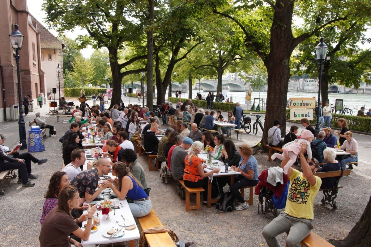 Das dritte Foodsave Bankett fand am Rheinufer im Zentrum von Basel statt. Über 400 Gäste kamen zusammen, um sich an einem reichhaltigen Buffet zu bedienen und niederschwellig ein Zeichen gegen Lebensmittelverschwendung zu setzen.