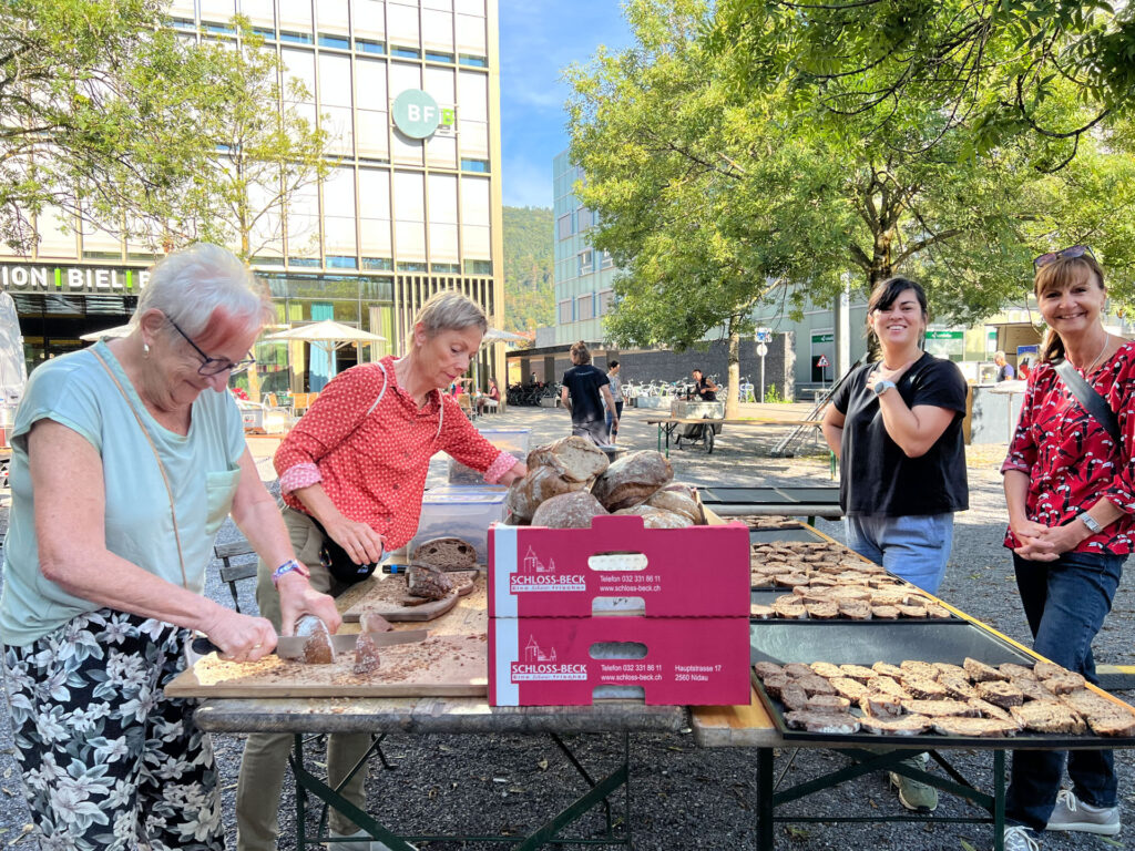 La 3e édition du Banquet de Bienne, qui s’est déroulée le 6 septembre sous un soleil radieux, a été un franc succès : 250 convives, plus de 50 bénévoles, une grande table joliment décorée, un délicieux repas composé principalement d’aliments régionaux et biologiques récupérés, et les témoignages émouvants prononcés de deux personnes touchées par la pauvreté. « Pour moi, ce banquet est synonyme d’espoir et de cohésion. Je souhaite y participer, car j’ai moi-même fait l’expérience de l’importance de la solidarité. Aujourd’hui, je sais que lorsque nous partageons ce que nous avons – que ce soit du temps, de l’énergie ou un morceau de pain –, nous rendons le monde un peu plus lumineux », a déclaré par exemple l’ukrainienne Nadiia Serdiuk. Nous nous sommes réjouis de la couverture médiatique, qui a permis de sensibiliser un large public à nos préoccupations concernant le gaspillage alimentaire, la pauvreté et la transformation des terres agricoles urbaines. Le groupe « Gustavo Swingtett » a mis de l’ambiance, tandis que le speedating philosophique organisé par le portail philosophie.ch a donné lieu à des discussions approfondies sur le thème de l’alimentation et de la pauvreté.