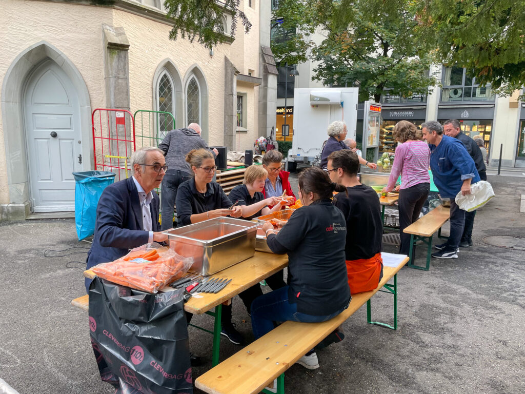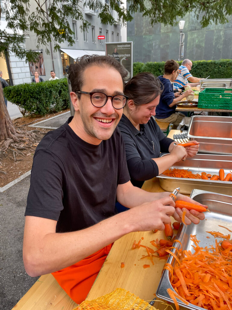 Freitag, 23.9., 18 bis 20 Uhr: Von Freiwilligen wird überschüssiges Gemüse und Obst für das Festessen geschnippelt.