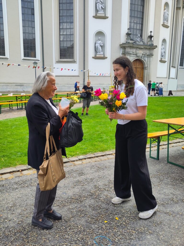 Für Farbe und eine festliche Stimmung sorgten Blumen, die ein Blumengeschäft zur Verfügung gestellt hatte. Die aussortierten Blumen, die nicht mehr ganz den Qualitätskriterien entsprachen, wurden von einer nahe gelegenen Altersgruppe auf Vordermann gebracht und durften auf dem Bankett nochmals richtig zur Geltung kommen.